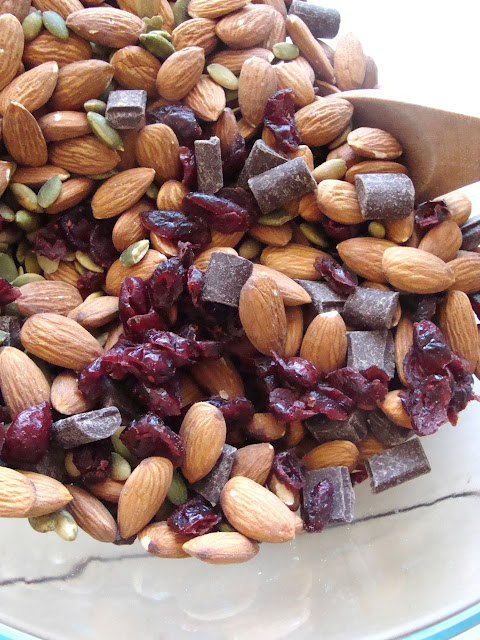 Some of the foods I always make, never buy, are basil pesto, granola, salad dressing, almost any dessert (I even made Oreos once), and--the subject of today's post--trail mix. This trail mix is so simple and basic that I don't know if I can even claim to have "made" it--I just combined four delicious ingredients in a bowl. But it's worth sharing precisely because of the simplicity. Sure, there are a million varieties of trail mix available in stores, but when it's so easy, so delicious, so healthful to make your own, why buy?