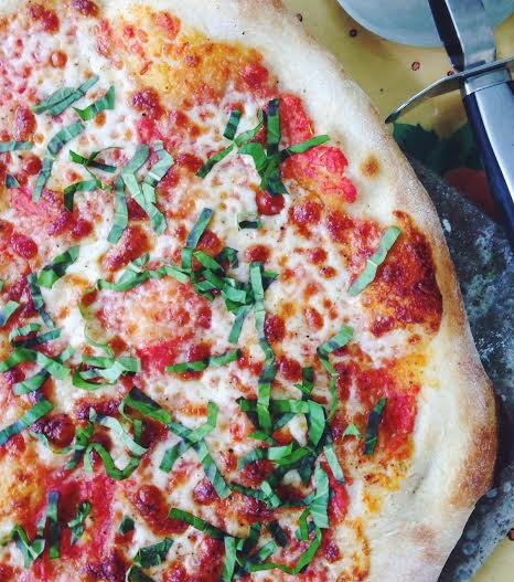 Spread a very thin layer of sauce on your rolled out dough, between 3 tablespoons and a quarter cup. (I cheat and get my dough for a bargain at Trader Joe's because me and yeast don't get along.) Next add thin layers of sliced mozzarella and lots of freshly cracked pepper. Bake on a pizza stone with a sprinkle of flour between the dough and the stone at the hottest temperature your oven will permit. I bake pizza at 550 degrees.